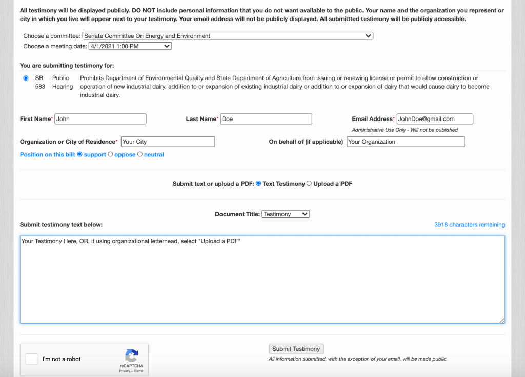 And we know that the Oregon Legislature’s website can sometimes be complicated, so here’s what your submission should look like: